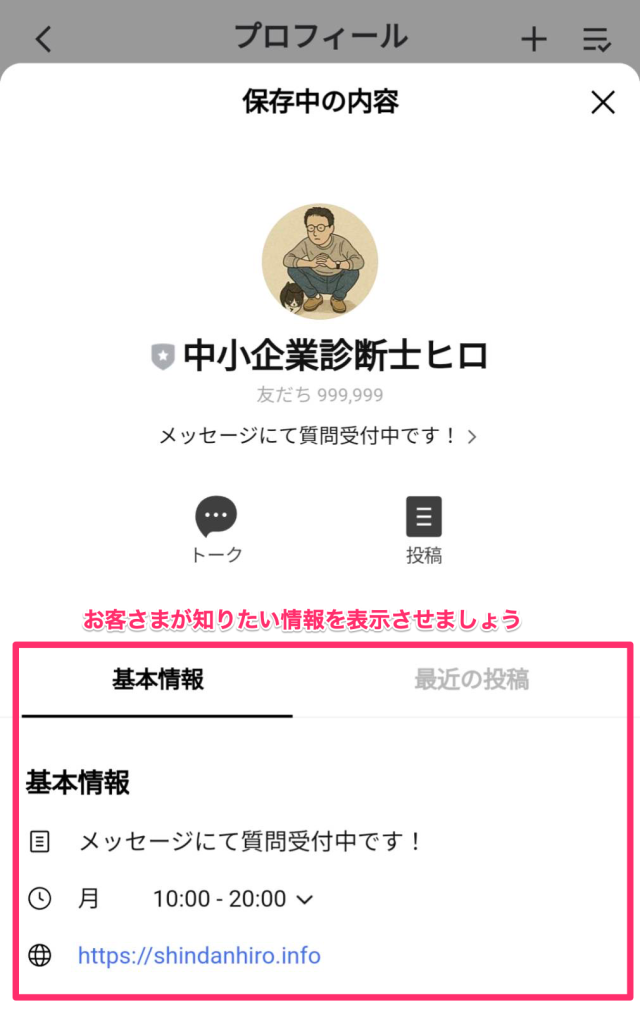 画像はお店のロゴや店主の顔写真など、親しみの持てるものを選びましょう。また質問バッジを↓の画像での「トーク」アイコンです。こちらを設定することでお客さまがメッセージを送りやすくなります。