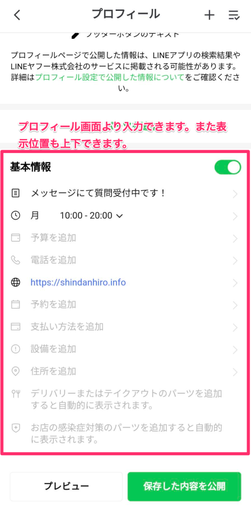 営業時間・定休日、電話やURLなどの基本的な情報から予算、支払い方法などを設定可能です。お客さまが知りたい情報はどんどん設定しましょう。