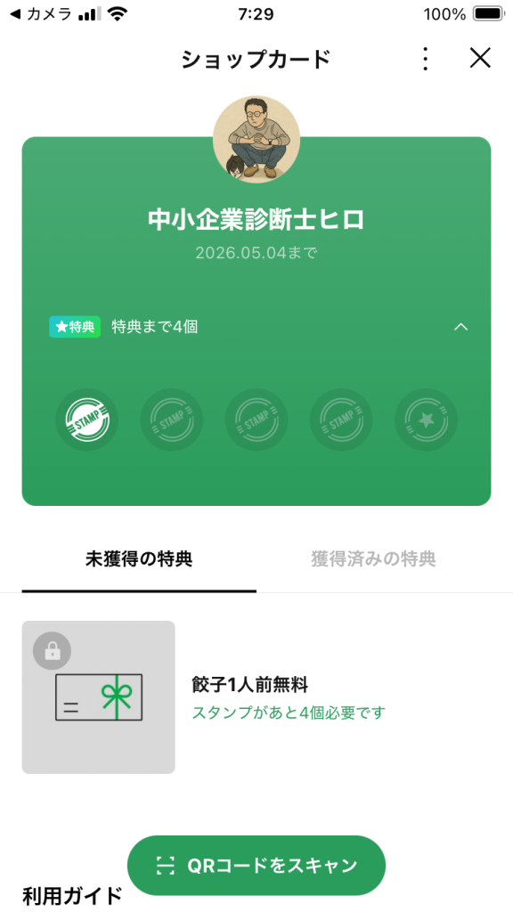 ショップカードは↓のような来店ごとにスタンプを押す紙のスタンプと同じ感覚で運用できます。