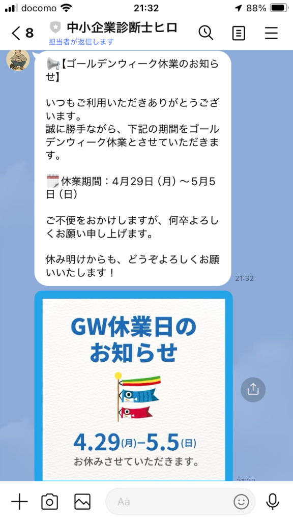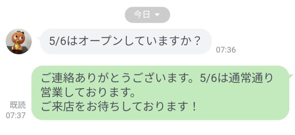 また以下のように臨時休業のお知らせなんかもメッセージでお伝えできます。